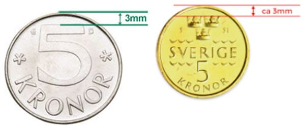 Detta går lika bra att göra med en tunn linjal, skjutmått eller 5-kronan. Bilden visar hur du mäter med både den gamla och den nya femman.